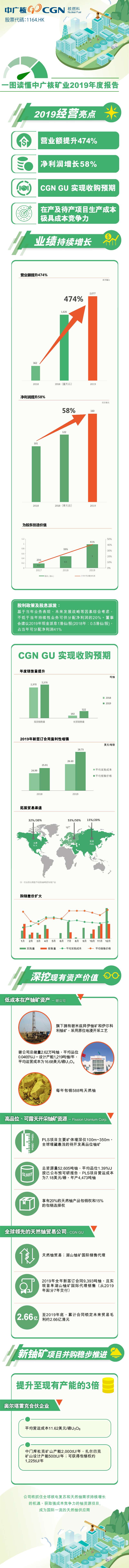 回顧中廣核礦業的2019年,謝米茲拜伊鈾公司旗下的謝礦及伊礦圓滿完成全年生產任務。Fission公司旗下的PLS項目在2018年的基礎上繼續勘探,儲量持續增長,分別于20195月及11月完成了“露天+地下聯合開采”及“全地下開采”的預可研報告,兩份報告均顯示PLS項目經濟性良好,且具進一步上升潛力。20191月,公司完成對中廣核國際鈾產品銷售有限公司(CGN GU100%股權收購。該交易實現了收購預期,2019CGN GU實現凈利潤1,497萬港元,同時擴大貿易規模、拓展了客戶群體,實現銷售3,108噸鈾,新簽訂貿易合同9,393噸鈾,成為全球前三大天然鈾貿易商。2019年,公司完成待收購項目奧爾塔雷克公司的全面盡職調查并啟動了商務談判進程。未來公司將抓住全球核電復蘇和天然鈾需求持續增長的機遇,獲取強成本競爭力的鈾資源項目,致力于成為國際一流的天然鈾供應商。